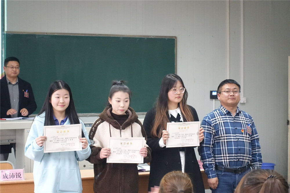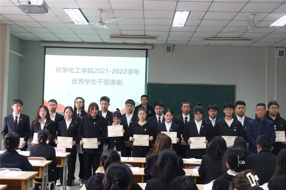 会议第四项,化学化工公司优秀员工表彰仪式。团总支书记成沛锐宣读《化学化工公司2021-2022学年优秀员工干部》、《2022-2023迎新优秀志愿者》和化学化工公司第二课堂活动的获表彰同学名单。由党总支书记王永东、青年教师兼职团总支副书记武立州、学工办主任王瑜对以上员工进行颁奖。