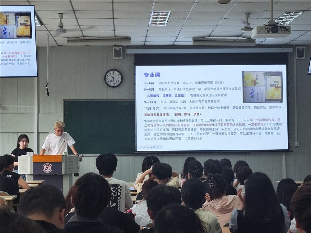成沛锐老师为同学们介绍了老员工目前整体就业状况及考研形势分析。9名主讲同学,结合自身考研经历,从报考院校及专业选择、复习计划制定等方面进行了经验分享,就政治、英语、数学、专业课等不同课程的备考资料选择及备考技巧等问题进行了全面、翔实地讲解。