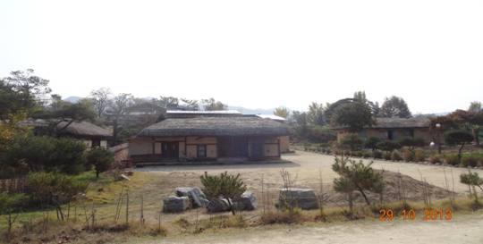 到了河回村,右边看到的是纪念伊丽莎白女王莅临访问的纪念馆,正面就是一幢古宅,让我们感觉整个村庄就像一幅幅美丽的田园风光图。河回村是柳氏所创建的,来到这里就要参观柳氏宗宅、忠孝堂(接待客人)、永慕阁等地方。