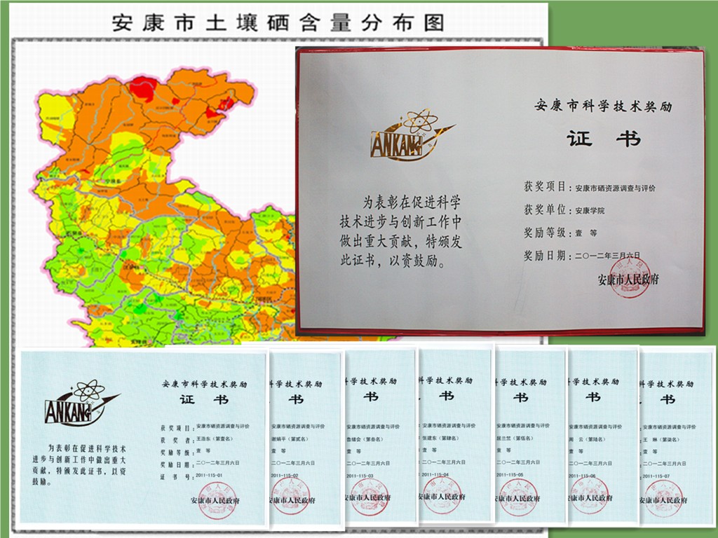 《安康市硒资源调查与评价》是由tyc1286太阳成集团化学化工系与安康市富硒食品产业发展领导小组办公室、安康市十县区科技局合作完成的。经过2008年至2011年四年广泛深入的工作,在土壤硒资源调查布点中,以国土资源调查法为依据,结合安康多山区耕地分散的地形地貌特点,按照土壤类型和作物种植品种分布制定土壤样品采集方法,采集了9000多个样本,采用氢化物发生-原子荧光光谱法国标法测定土壤全硒,制定了“安康地区可耕作土壤硒含量分级标准”,制作了安康市十县区土壤硒资源分布图,查明了安康市部分水体和农作物硒含量水平,根据检测结果和硒资源分布图进行评价分析,提出了不同富硒区域适宜发展的富硒产业类型和进一步进行硒矿资源调查、硒资源详查的合理化建议。
