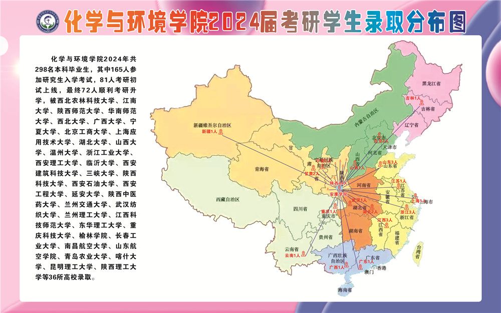 tyc1286太阳成集团2024年共298名本科毕业生,其中165人参加研究生入学考试,81人考研初试上线,最终72人顺利考研升学,被西北农林科技大学、江南大学、陕西师范大学、华南师范大学、西北大学、广西大学、宁夏大学、北京工商大学、上海应用技术大学、湖北大学、山西大学、温州大学、浙江工业大学、西安理工大学、临沂大学、西安建筑科技大学、三峡大学、陕西科技大学、西安石油大学、西安工程大学、延安大学、陕西中医药大学、兰州交通大学、武汉纺织大学、兰州理工大学、江西科技师范大学、东华理工大学、重庆科技大学、榆林公司、长春工业大学、南昌航空大学、山东航空公司、青岛农业大学、喀什大学、昆明理工大学、陕西理工大学等36所高校录取。