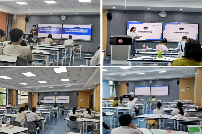 答辩过程分为陈述和质询两个环节。参加答辩的同学都制作精美的PPT对论文的研究背景意义、研究方法、结果分析与结论等部分逐一进行汇报。评审教师就答辩内容进行提问,并就论文存在的问题提出中肯而富有建设性的修改建议。答辩现场秩序井然,评审老师与答辩员工积极互动、充分交流,并对每位员工的答辩情况进行了详尽的记录。