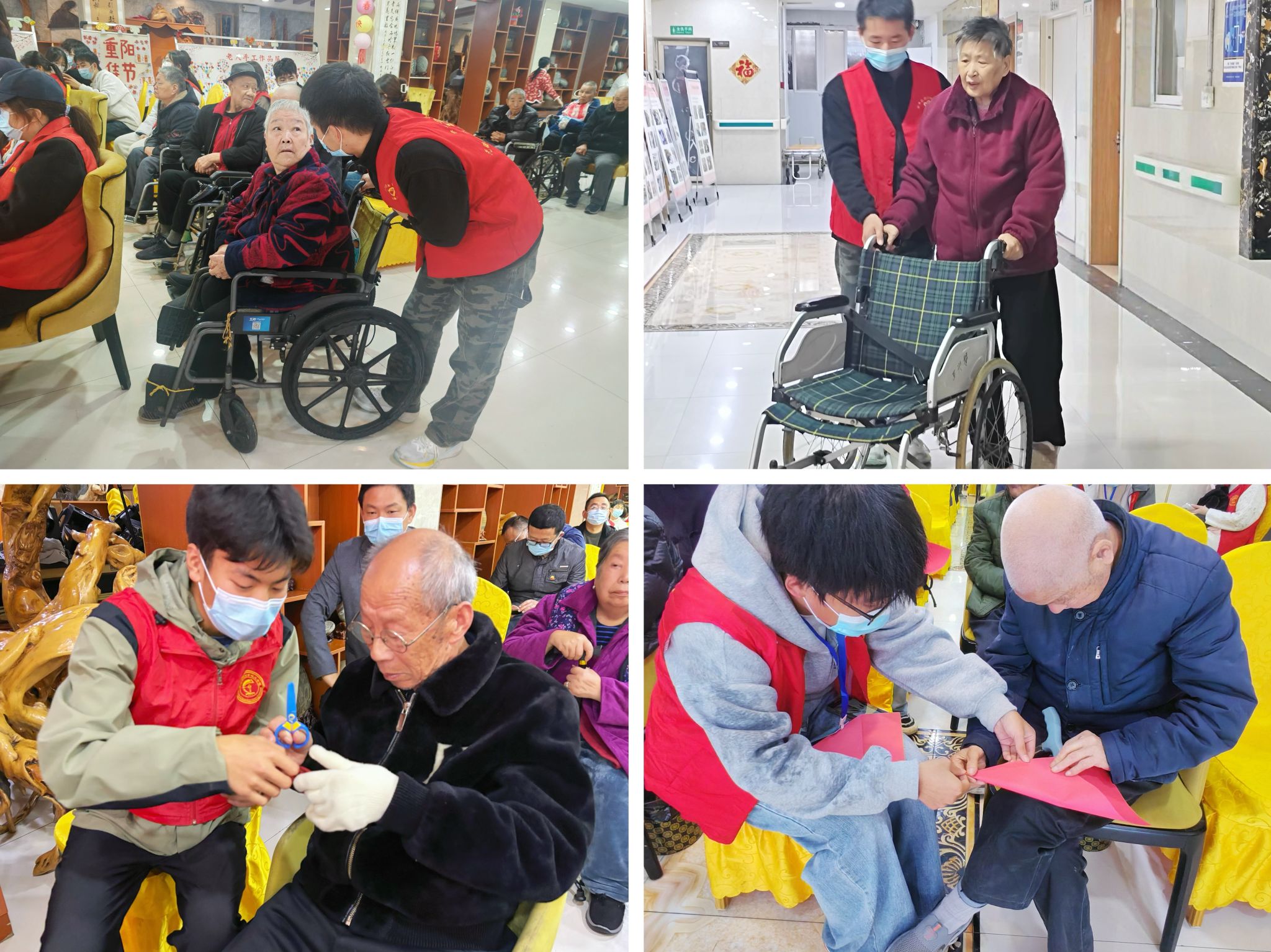 志愿者们分组与老人亲切交流,聆听老党员、老战士讲述革命年代的奋斗故事;陪同老人参与“福”“寿”主题剪纸活动,同学们悉心照料、耐心陪伴,以真挚行动传递温暖与敬意。