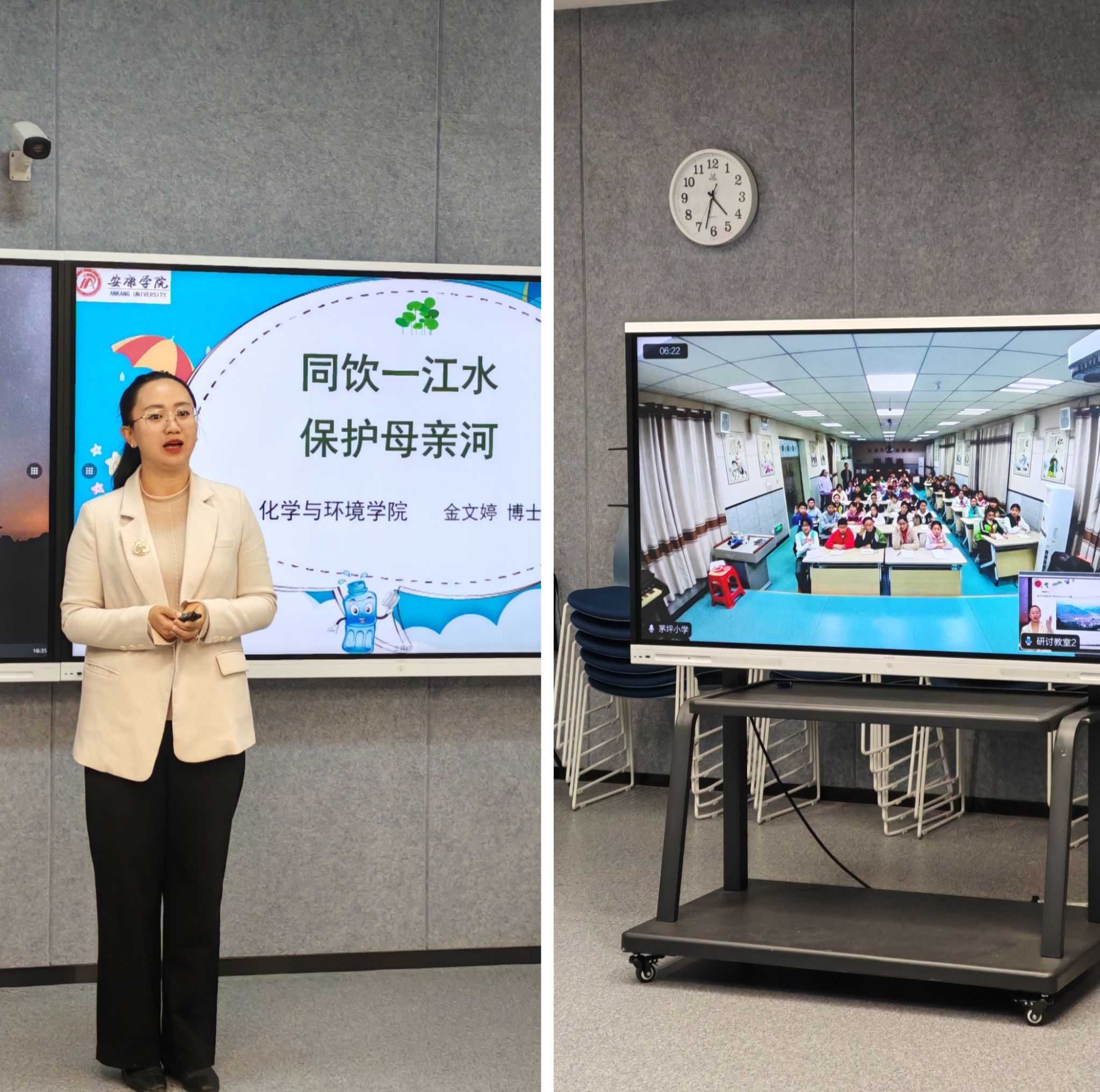 金老师首先介绍了“汉江全长1532公里,相当于绕400米的操场跑3830圈;流域面积15.9万平方公里,能放下222万多个足球场!”让大家知晓汉江的“基本模样”。通过汉江的水文化介绍了国家级非物质文化遗产“汉调二黄”,展示了安康龙舟文化节的热闹场景,让同学们了解汉江厚重的历史文化。通过大数据,介绍了如今的汉江流域水文气象服务系统、遥测雨量站、水库大坝等,利用大型水库调蓄和发电功能,它不仅滋养着流域内4900万人的生活,还撑起了南水北调、引汉济渭、鄂北调水三大工程,让近2亿人喝上了纯净的汉江水。最后,金老师向同学们发出了“保护汉江,从我们做起”环保倡议。
