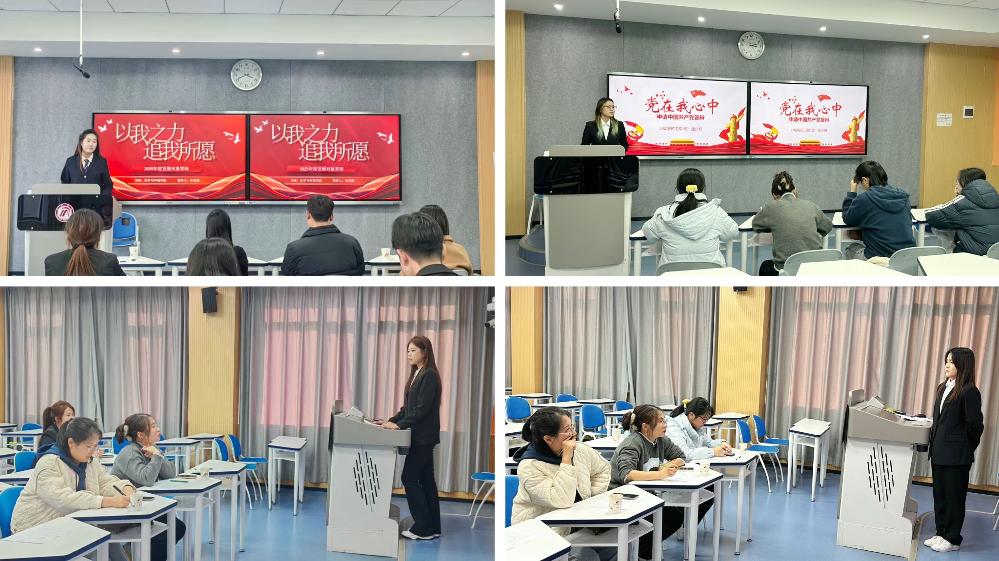 答辩环节中,29名发展对象按顺序依次上台,围绕个人基本情况、入党动机、党的理论学习收获、专业学习成绩、学科竞赛成效及社会实践经历等方面展开陈述。